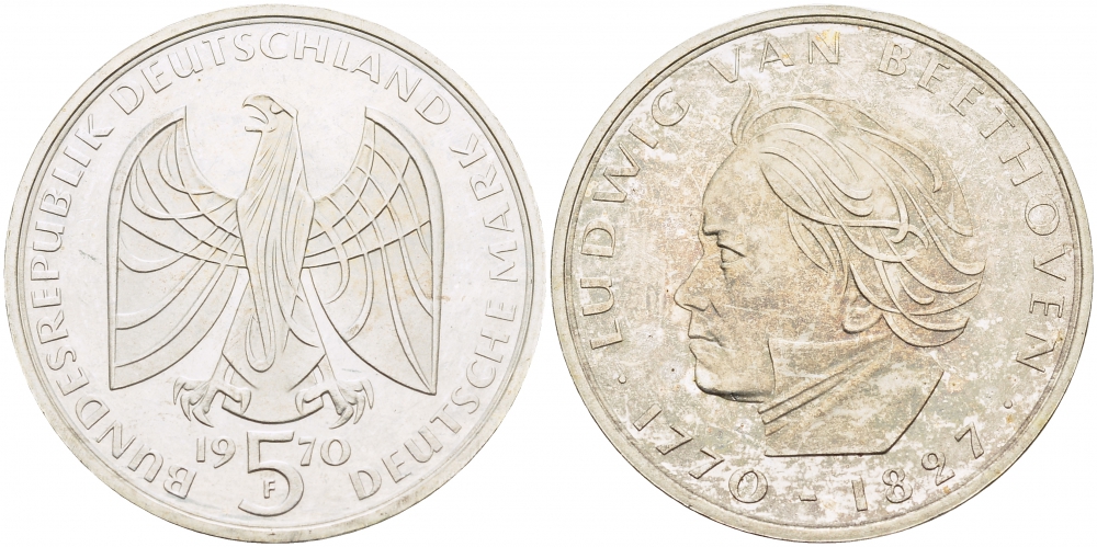 ФРГ 5 марок 1970 F. 200 лет со дня рождения Людвига ван Бетховена KM 127, J. 408 серебро PROOF 1087-2-75