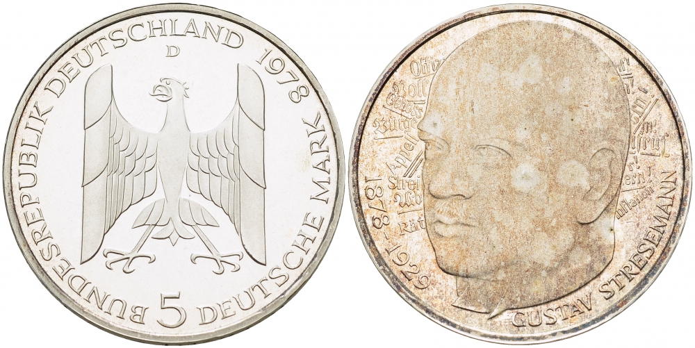 ФРГ 5 МАРОК 1978 D, 100 ЛЕТ СО ДНЯ РОЖДЕНИЯ ГУСТАВА ШТРЕЗЕМАНА KM 147, J. 422 серебро PROOF 1087-2-73