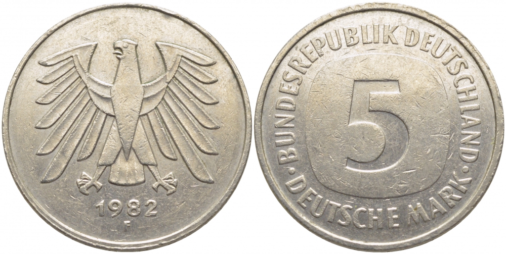 ФРГ 5 марок 1982 F, KM 140.1, J. 415 медно-никель плакированный никелем 109-916
