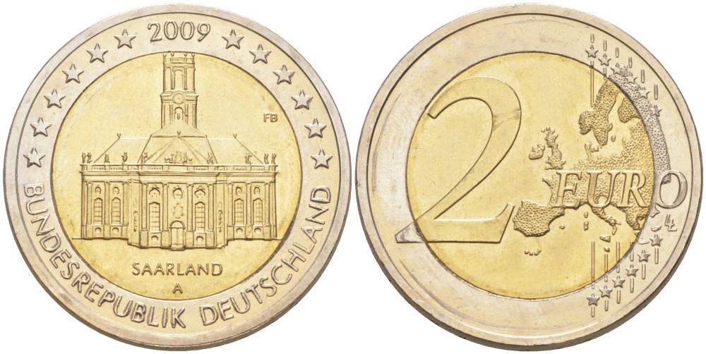 ФРГ 2 евро 2009 A, серия Федеральные земли, Саарланд, церковь Святого Людвига в Саарбрюккене KM 276 биметалл UNC 4111-814