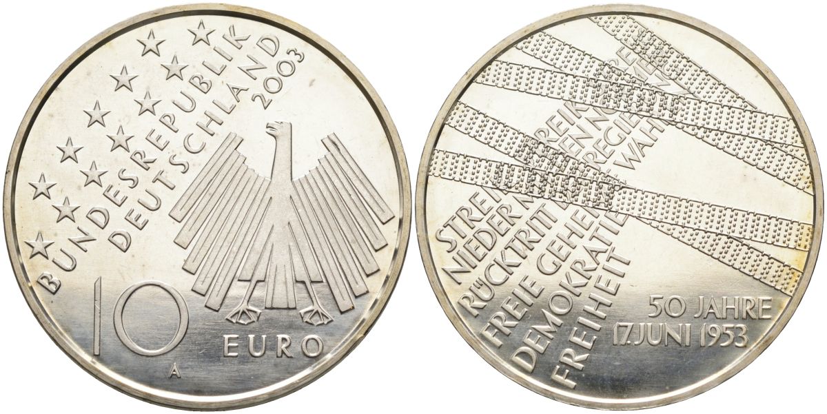 ФРГ 10 евро 2003 А, 50-я годовщина народного восстания 1953 года в ГДР KM 226, DE.S. 10.9 серебро PROOF 02-078-43