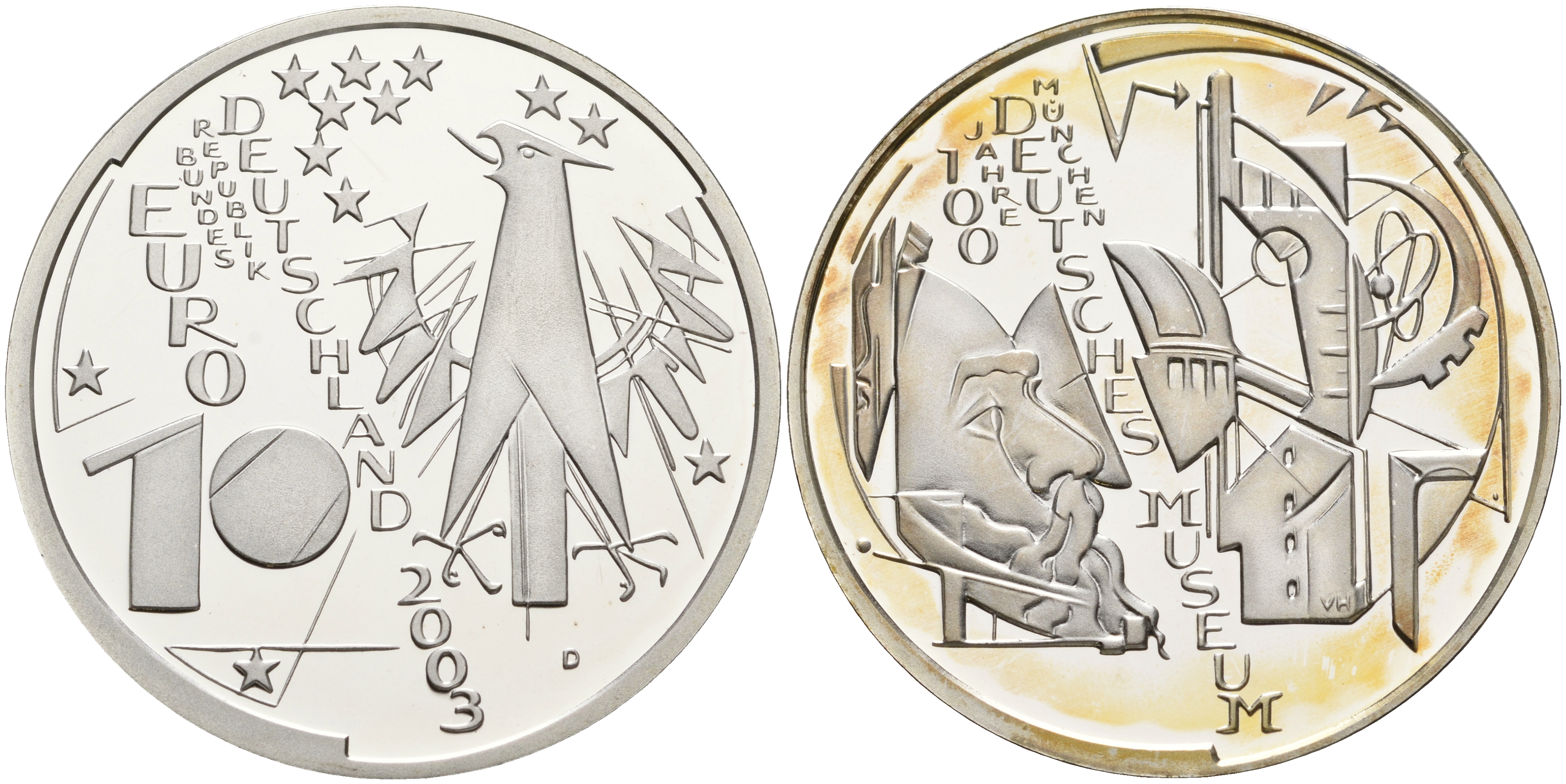 ФРГ 10 евро 2003 D, 100 лет немецкому музею в Мюнхене KM 225, DE.S. 10.6 серебро PROOF 1076-3-25