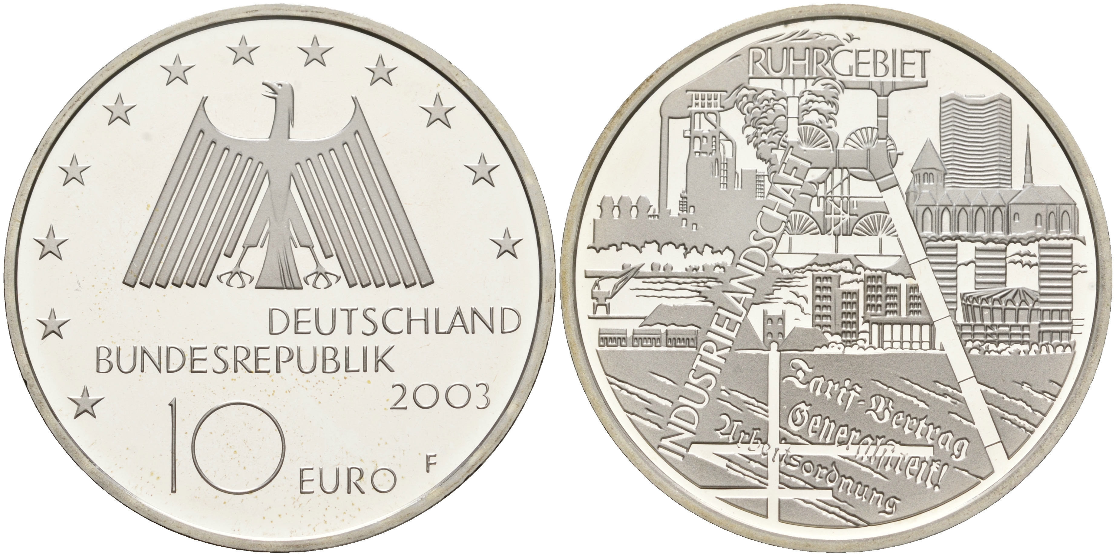 ФРГ 10 евро 2003 F, Рурский бассейн, промышленная зона KM 224, DE.S. 10.10 серебро PROOF 1076-3-33