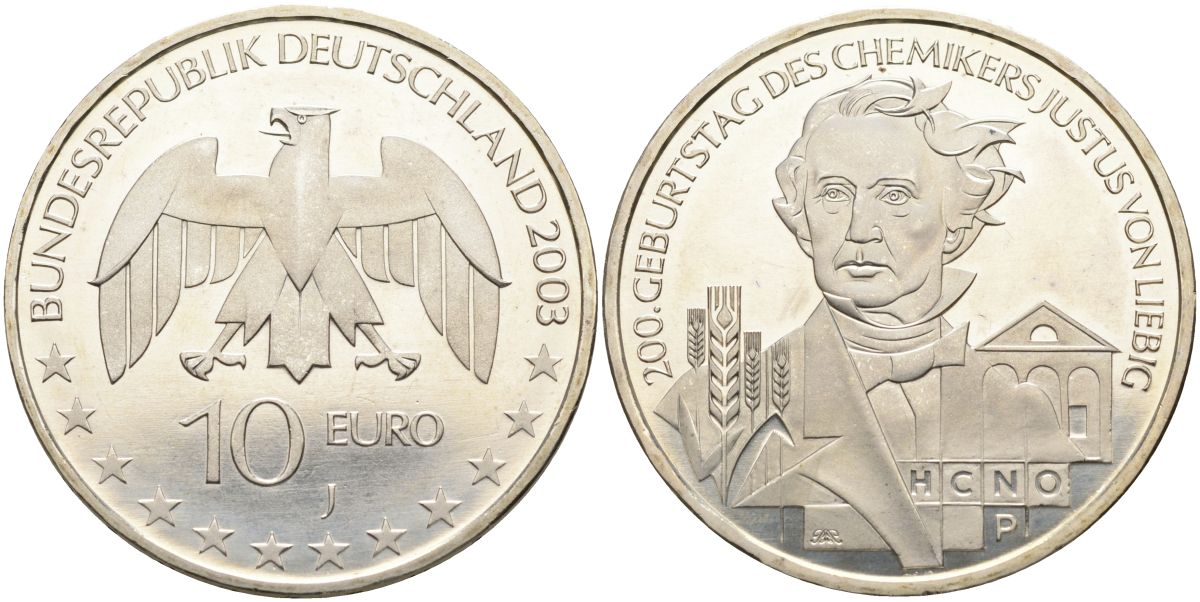 ФРГ 10 евро 2003 J, 200 лет со дня рождения Юстуса фон Либиха KM 222, DE.S. 10.7 серебро PROOF 02-116-25