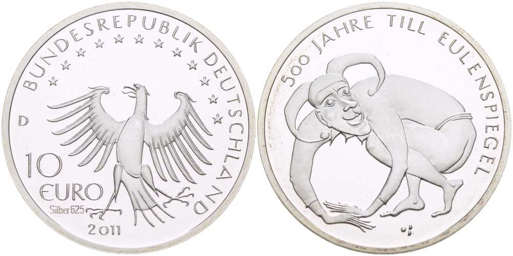 ФРГ 10 евро 2011 D, 500 ЛЕТ ТИЛЮ УЛЕНШПИГЕЛЮ KM 300а, DE.S 10.53 серебро PROOF 1082-9-24