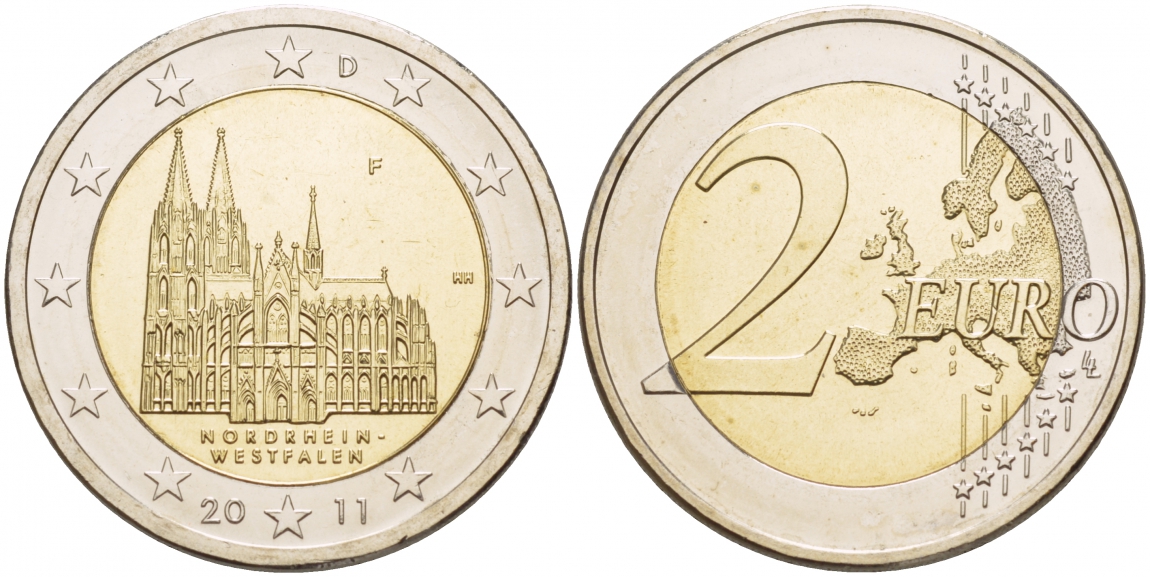 ГЕРМАНИЯ 2 ЕВРО 2011 F, СЕВЕРНЫЙ РЕЙН - ВЕСТФАЛИЯ, КЁЛЬНСКИЙ СОБОР, СЕРИЯ ФЕДЕРАЛЬНЫЕ ЗЕМЛИ ГЕРМАНИИ KM 293 биметалл UNC 1094-6-71