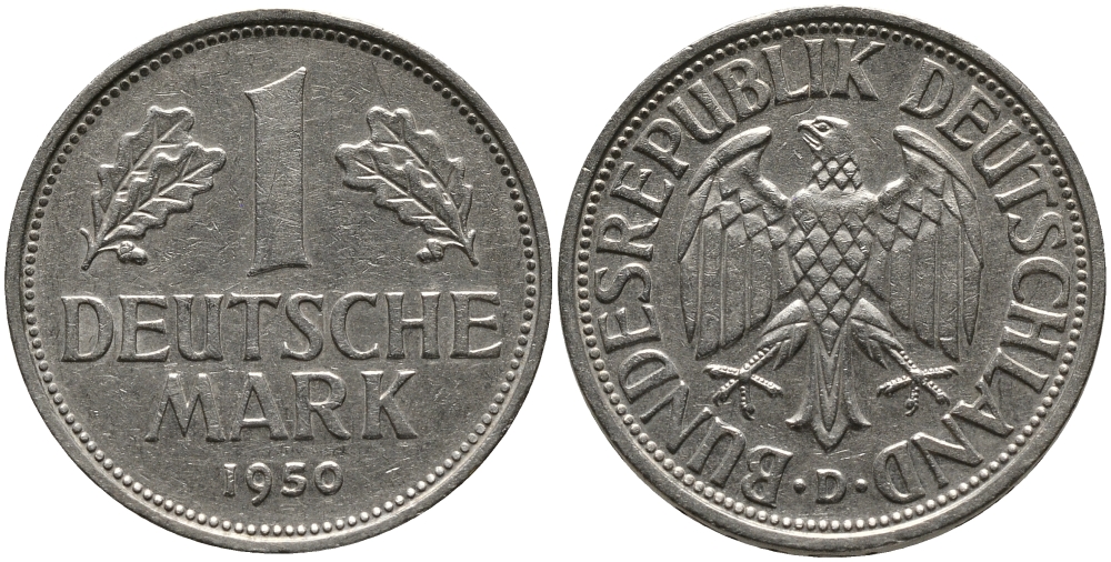 ФРГ 1 марка 1950 D, KM 110, J. 385 медно-никель 51-816