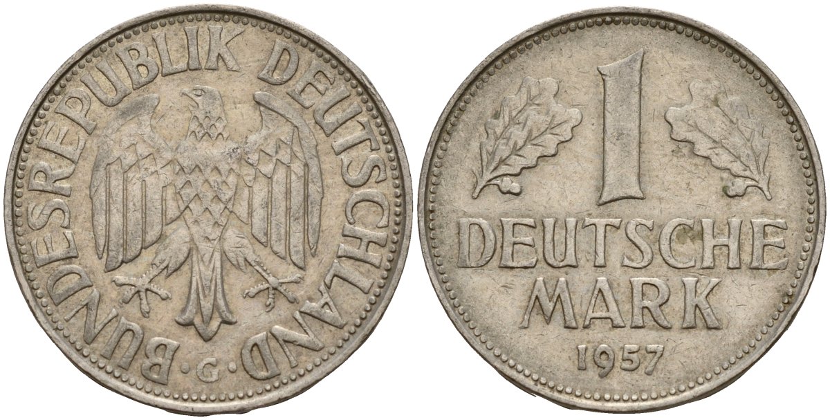 ФРГ 1 марка 1957 G KM 110, J. 385 медно-никель 4187-1115