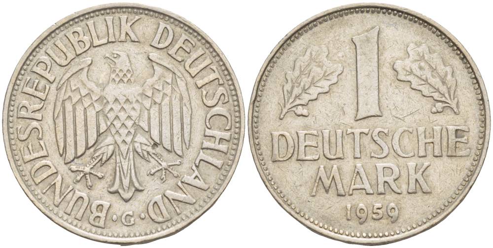 ФРГ 1 МАРКА 1959 G KM 110, J. 385 медно-никель 4551-1236