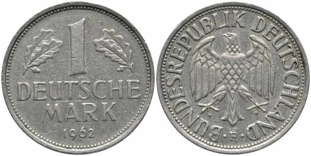 ФРГ 1 МАРКА 1962 F KM 110, J. 385 медно-никель 113-214