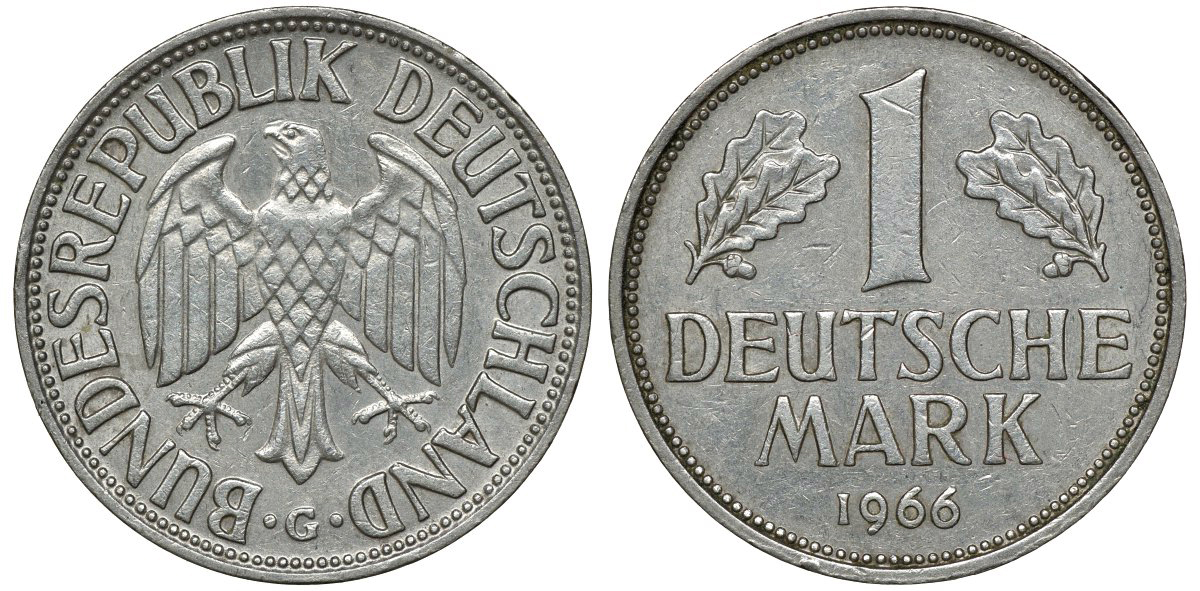ФРГ 1 МАРКА 1966 G KM 110, J. 385 медно-никель 72-744
