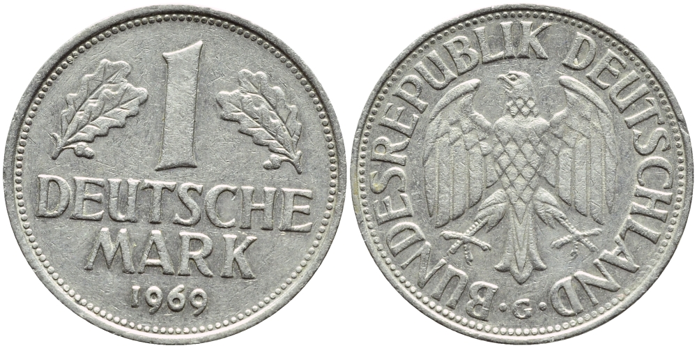 ФРГ 1 МАРКА 1969 G КМ 110 J.385 медно-никель 85-351