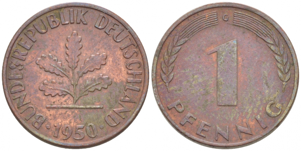 ФРГ 1 ПФЕННИГ 1950 G KM 105, J.380 сталь плакированная медью 3955-519