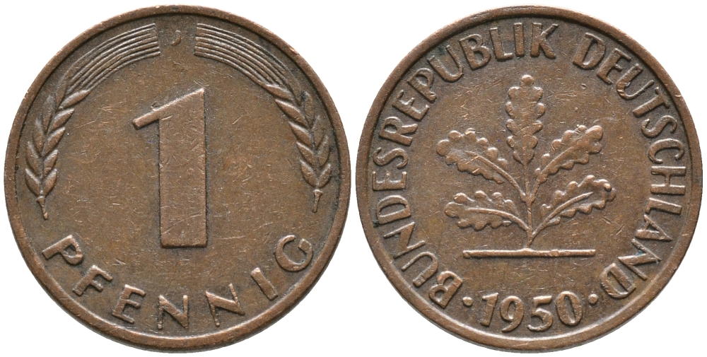 ФРГ 1 пфеннига 1950 J KM 105, J. 380 сталь плакированная медью 99-1253