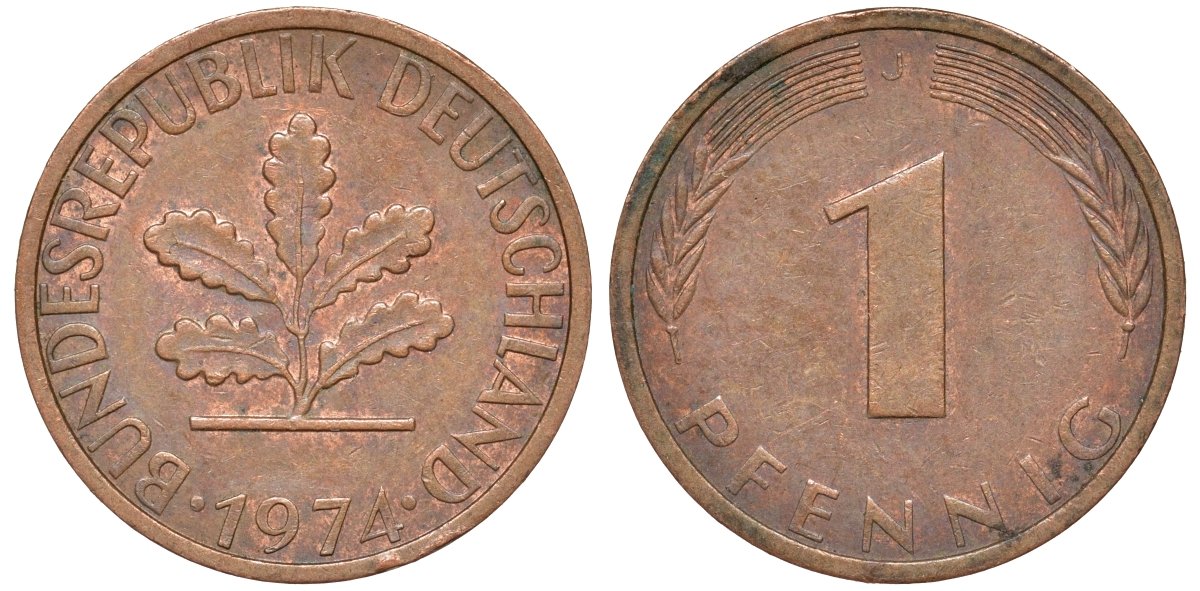 ФРГ 1 пфенниг 1974 J KM 105, J.380 сталь плакированная медью 4174-446