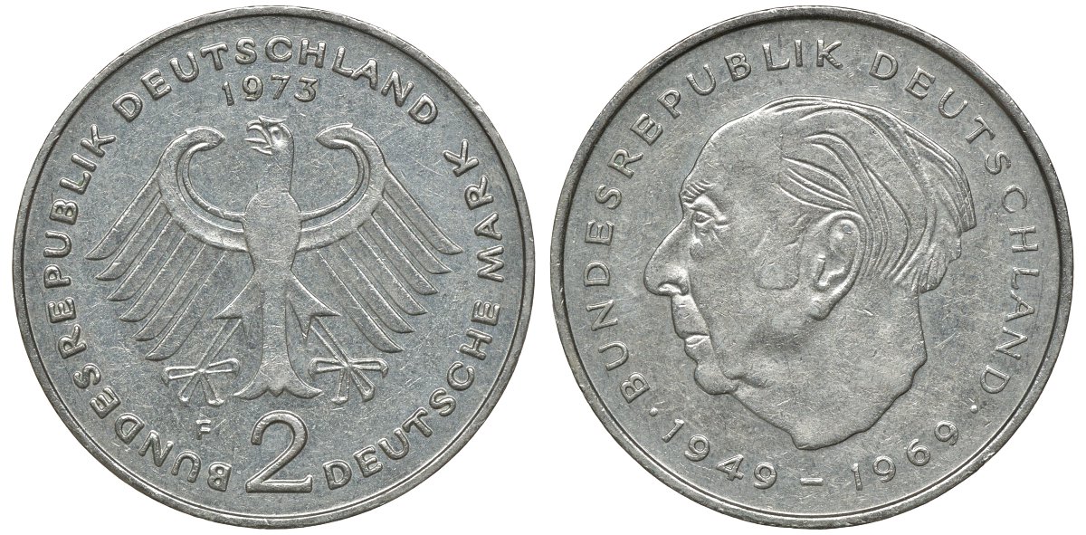 ФРГ 2 марки 1973 F, Теодор Хойс, 20 лет Федеративной Республике (1949-1969) KM A127, J. 407 медно-никель плакированный никелем плакированный никелем UNC 72-545
