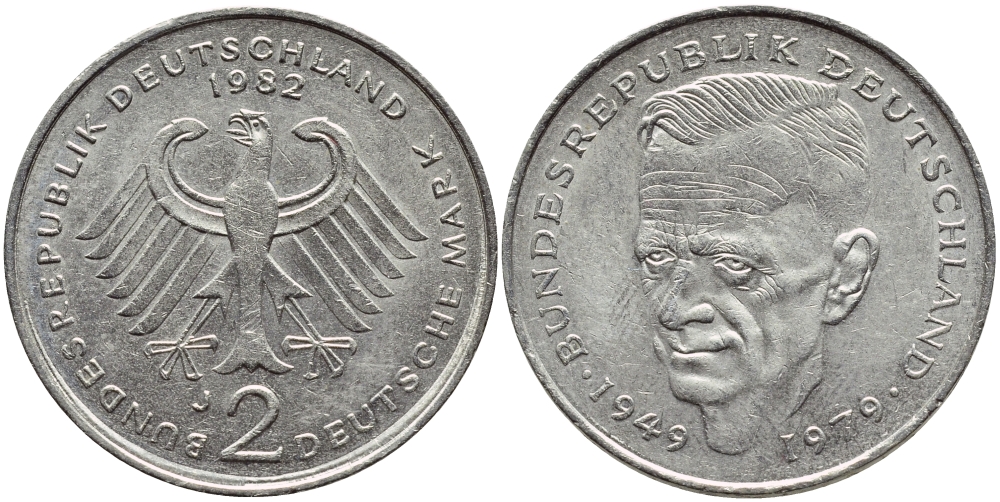 ФРГ 2 МАРКИ 1982 J, КУРТ ШУМАХЕР KM 149, J. 424 медно-никель плакированный никелем 80-211