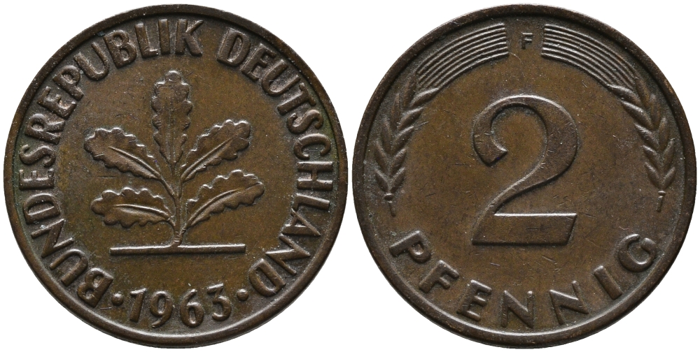 ФРГ 2 пфеннига 1963 F KM 106, J. 381 бронза 99-133