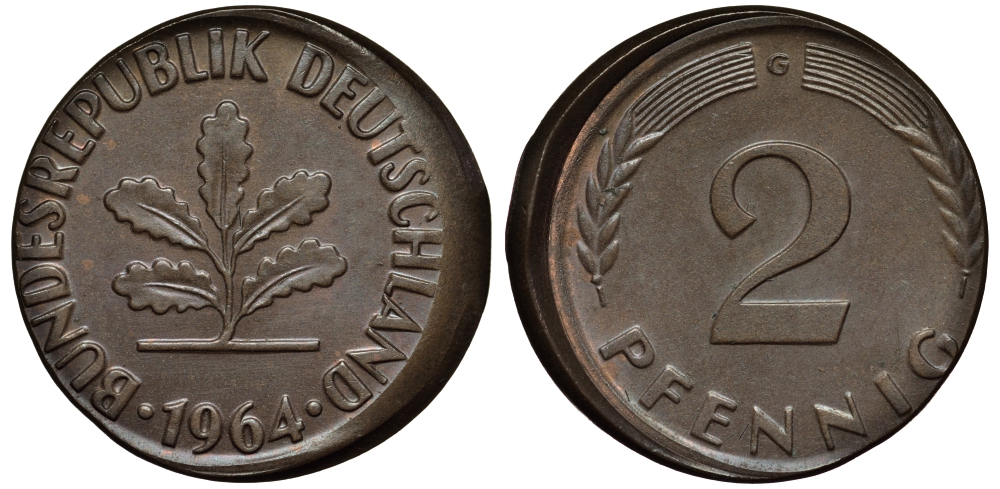 ФРГ 2 ПФЕННИГА 1964 G БРАК ЧЕКАНКИ СДВИГ ШТЕМПЕЛЯ KM 106, J.381 бронза 413-5143