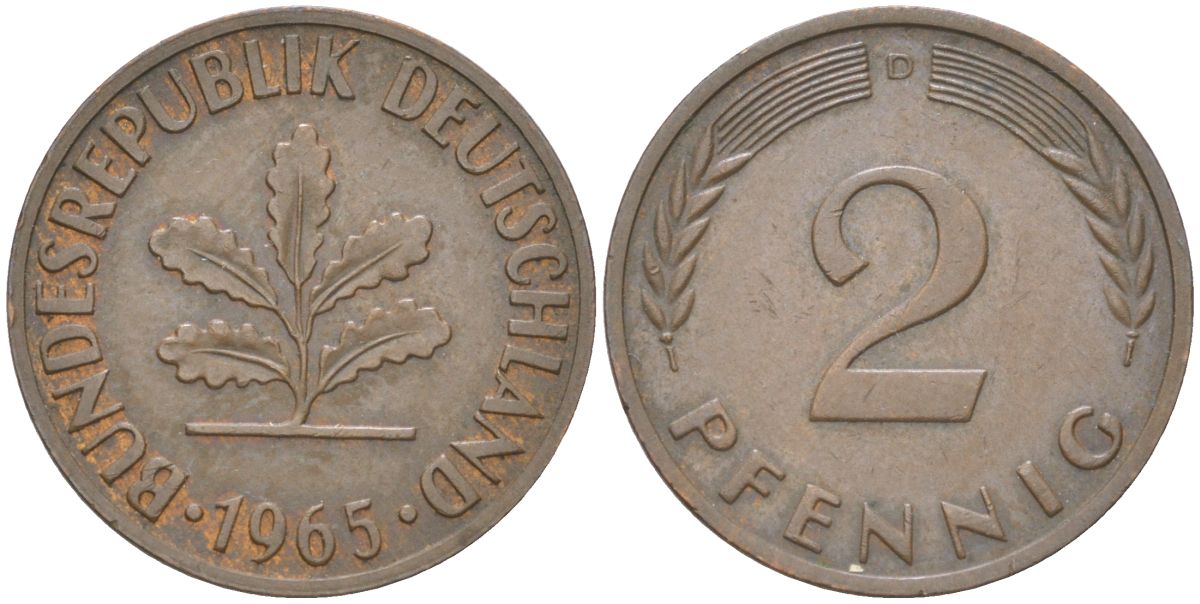ФРГ 2 пфеннига 1965 D KM 106 бронза 4613-1217