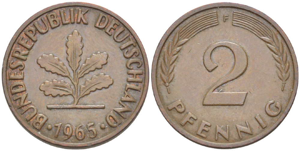 ФРГ 2 ПФЕННИГА 1965 F KM 106, J. 381 бронза 4181-744