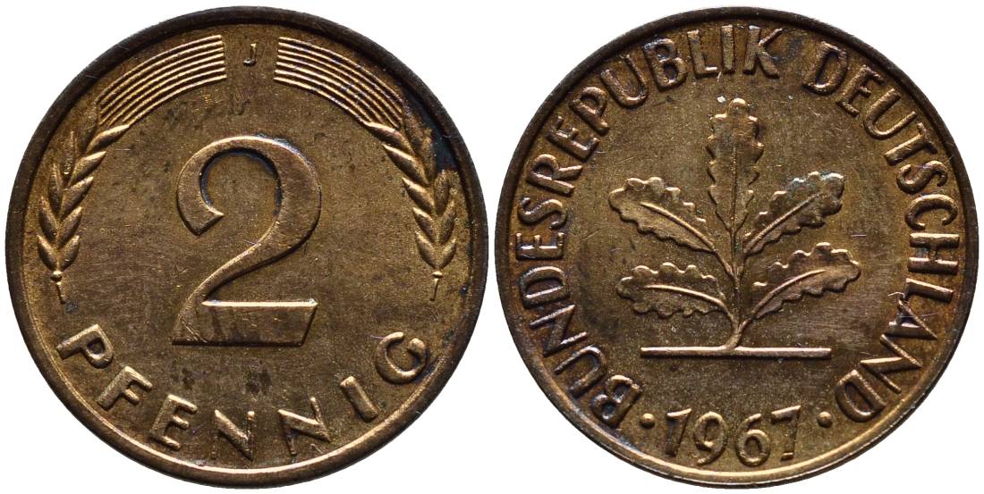 ФРГ 2 ПФЕННИГА 1967 J KM 106, Jager 381 бронза 4546-944