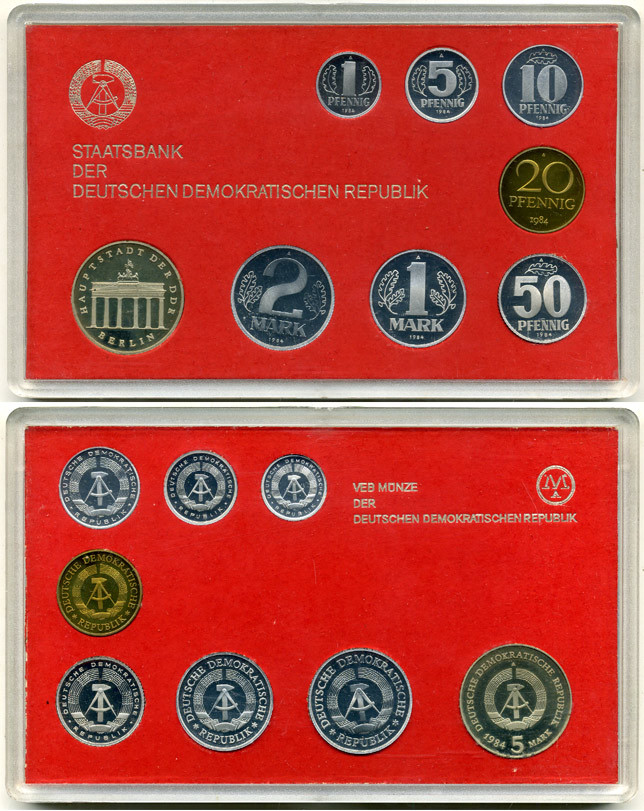ГДР официальный набор из 8 монет включая 5 марок Бранденбургские ворота 1984 тираж 3015 экземпляров, твердый пластик KM PS 5 PROOF 4-3-5-25