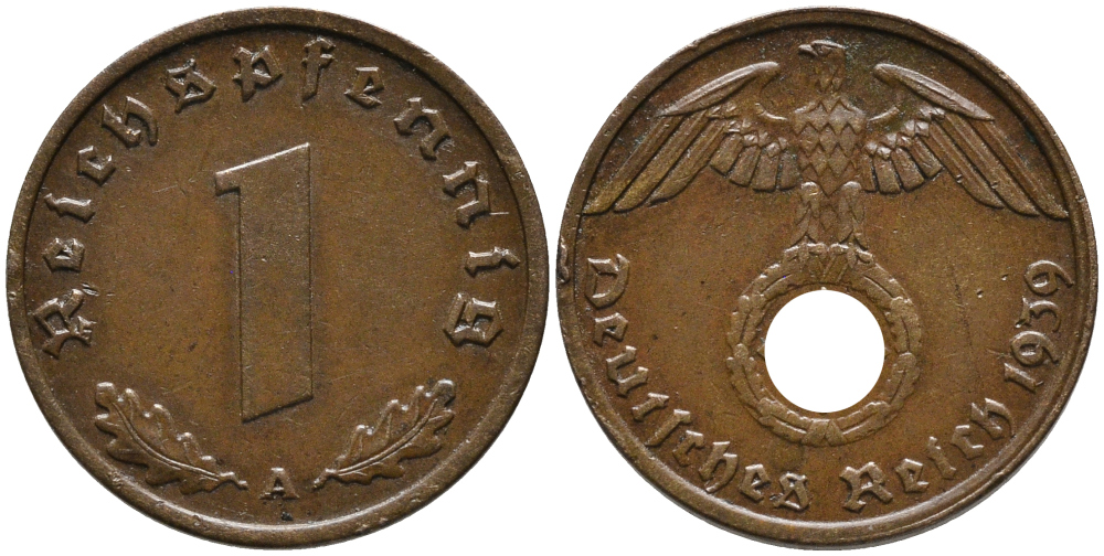 ГЕРМАНИЯ 1 РЕЙХСПФЕННИГ 1939 А KM 89, J.361 бронза 179-1025