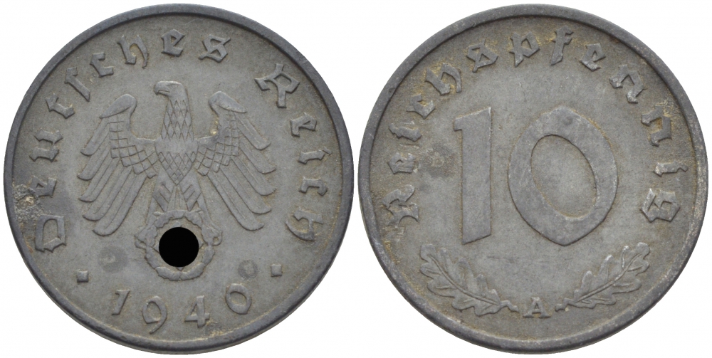 ГЕРМАНИЯ 10 РЕЙХСПФЕННИГОВ 1940 A, KM 101, J. 371 цинк 110-252