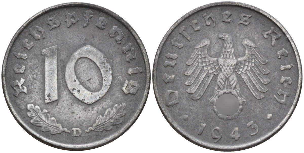 Германия 10 рейхспфеннигов 1943 D KM 101, J.371 цинк 4151-251