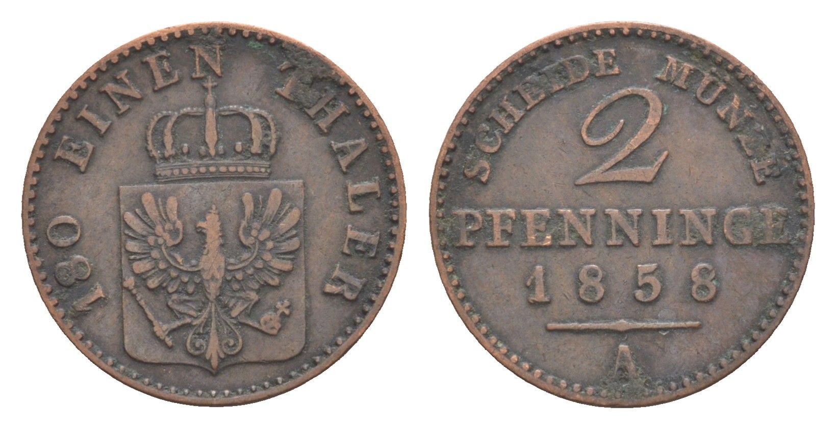 Пруссия 2 пфеннига 1858 A, Фридрих Вильгельм IV (1840-1861) KM 452, Jaeger 51, Olding 336, AKS 91 медь 4651-253