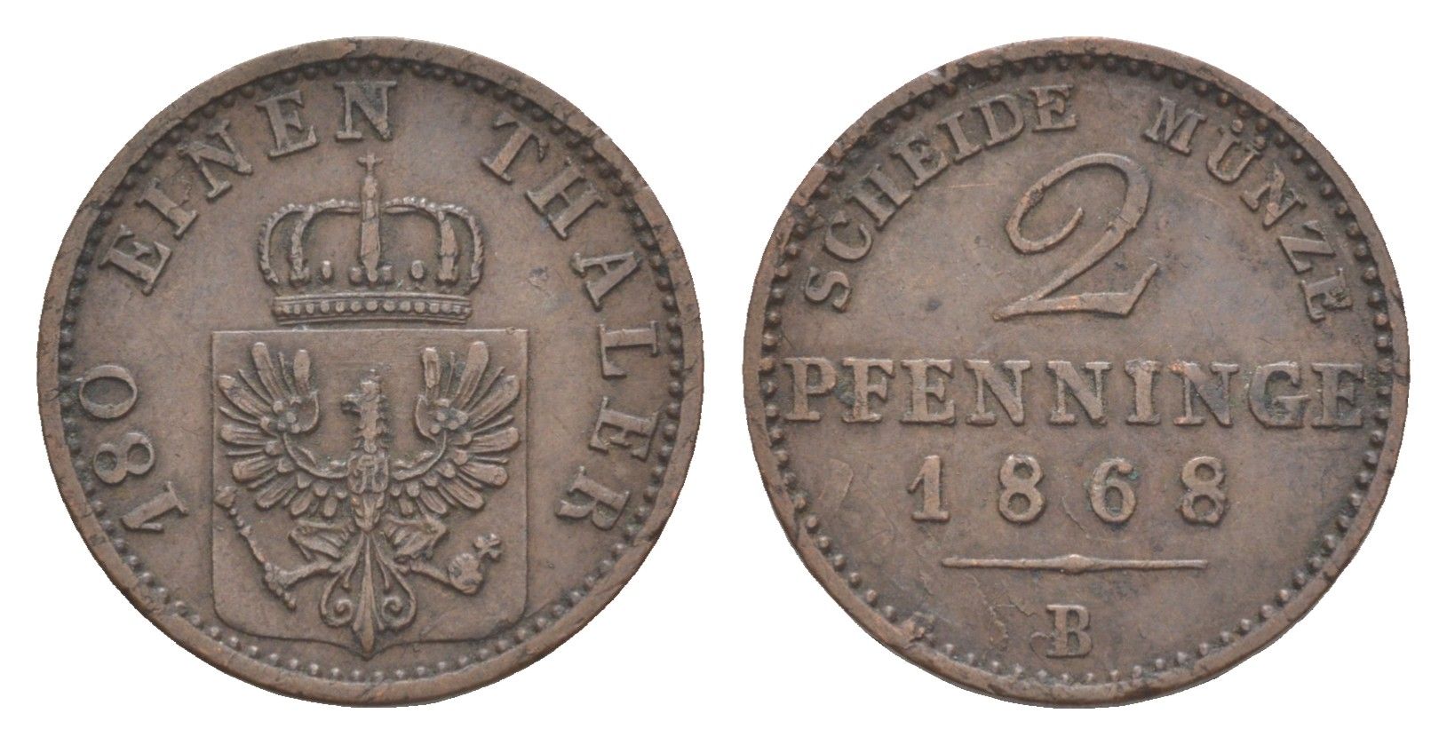 Пруссия 2 пфеннига 1868 B, Вильгельм I (1861-1888) KM 481, Jaeger 51, AKS 107, Olding 425 медь 4651-321