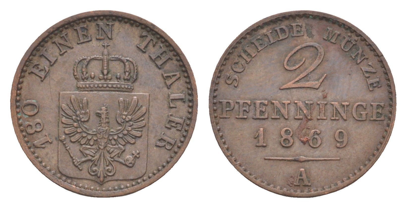 Пруссия 2 пфеннига 1869 A, Вильгельм I (1861-1888) KM 481, Jaeger 51, AKS 107, Olding 425 медь 4651-245