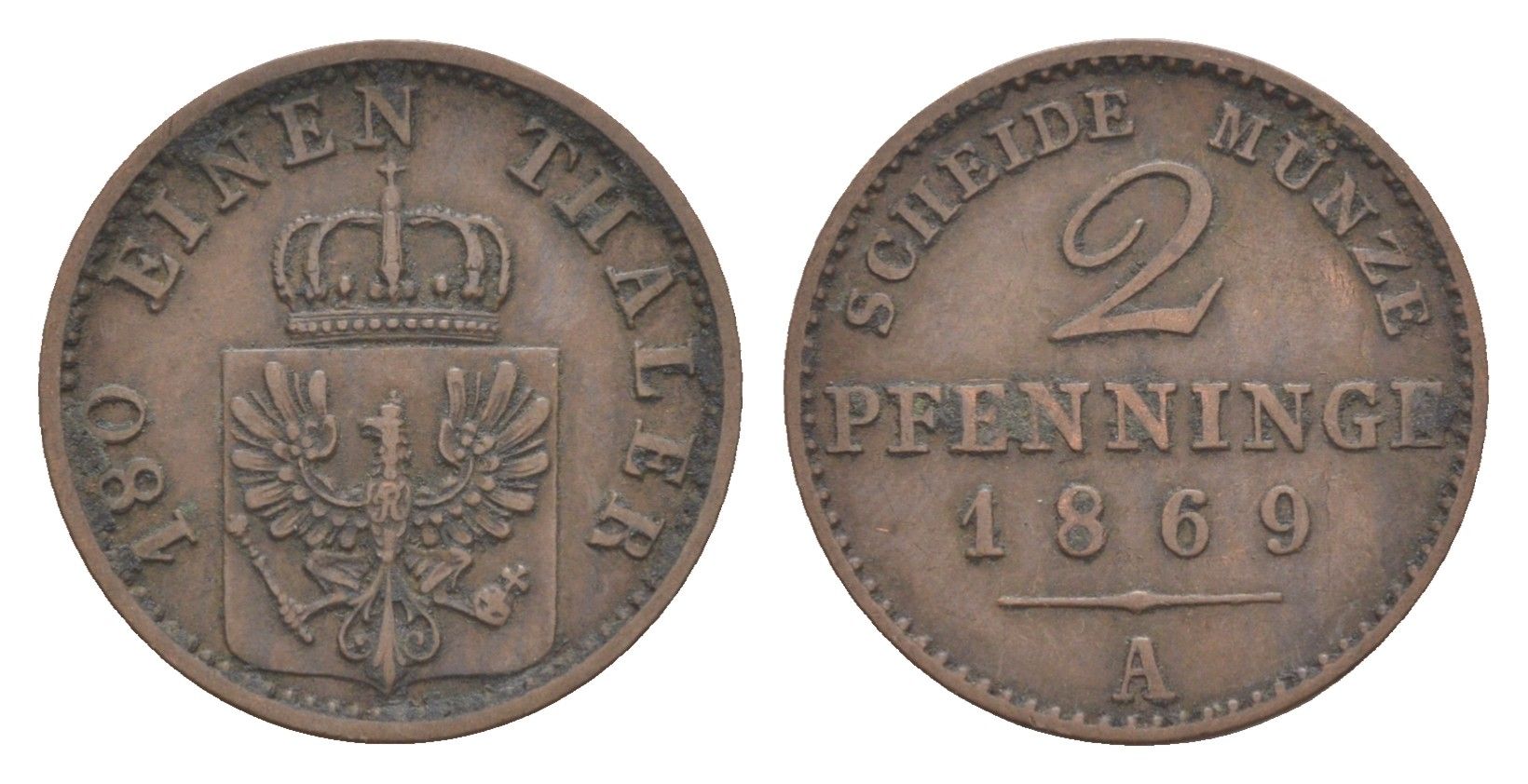 Пруссия 2 пфеннига 1869 A, Вильгельм I (1861-1888) KM 481, Jaeger 51, AKS 107, Olding 425 медь 4651-323
