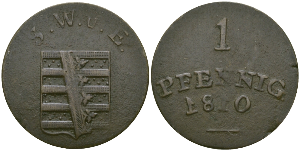 Саксен-Веймар-Эйзенах 1 пфенниг 1810 S.W.U.E. , Карл Август (1758-1809-1828), редкий вариант зеркальные "1" KM 56d медь 99-555