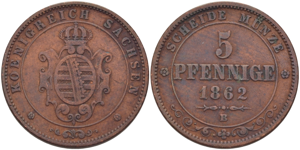 САКСОНИЯ 5 ПФЕННИГОВ 1862 B, ЙОХАНН (1854-1873) KM 1218 медь 28-445