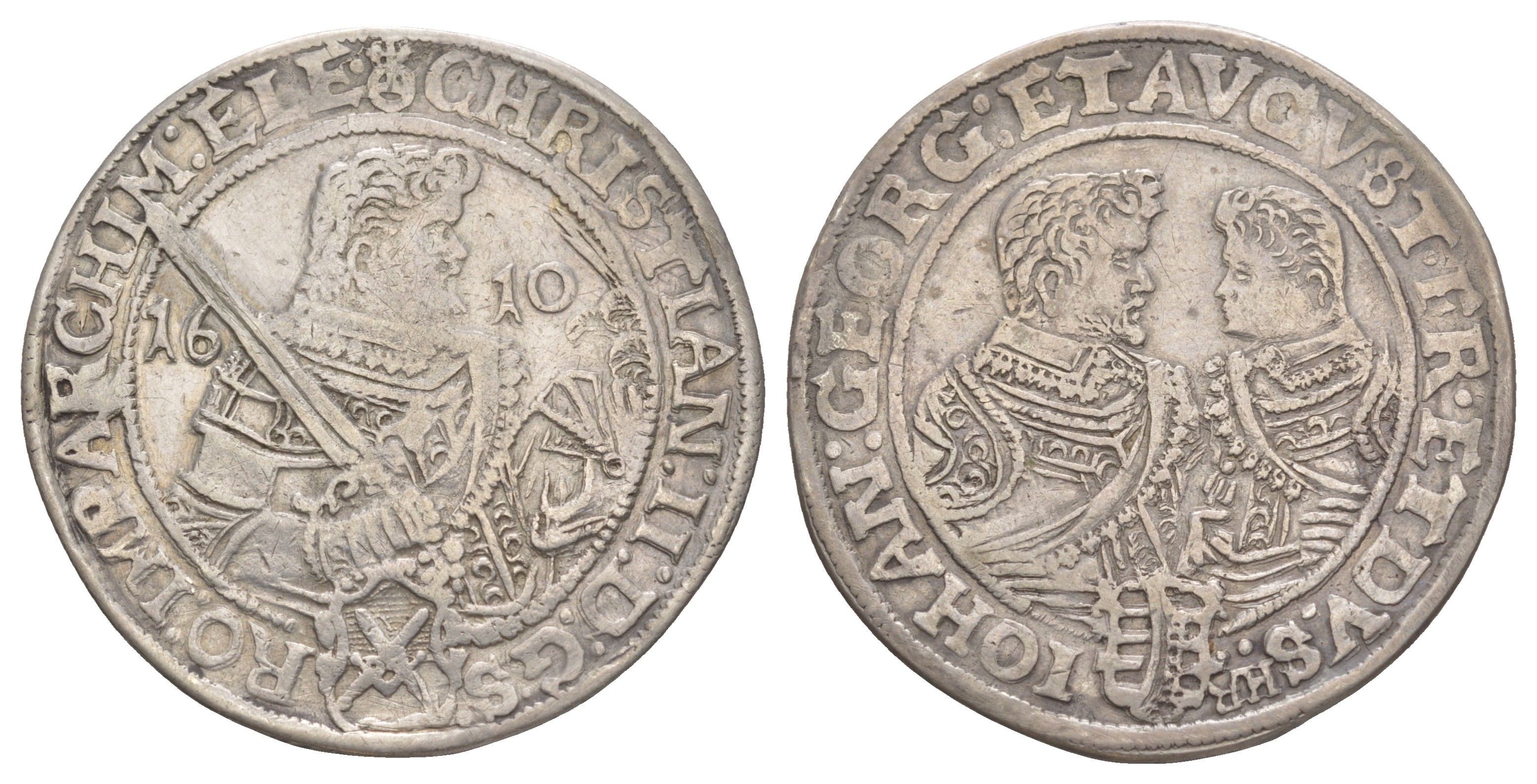Саксония, Альбертинская линия 1 талер 1610 Кристиан II, Иоган Георг I и Август - Три брата KM 24, Davenport 7566, Schnee 760 серебро 00-805-21