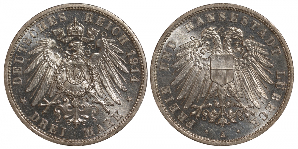 Любек 3 марки 1914 A Weege 82, J. 82, KM 215 серебро UNC 10-014-28