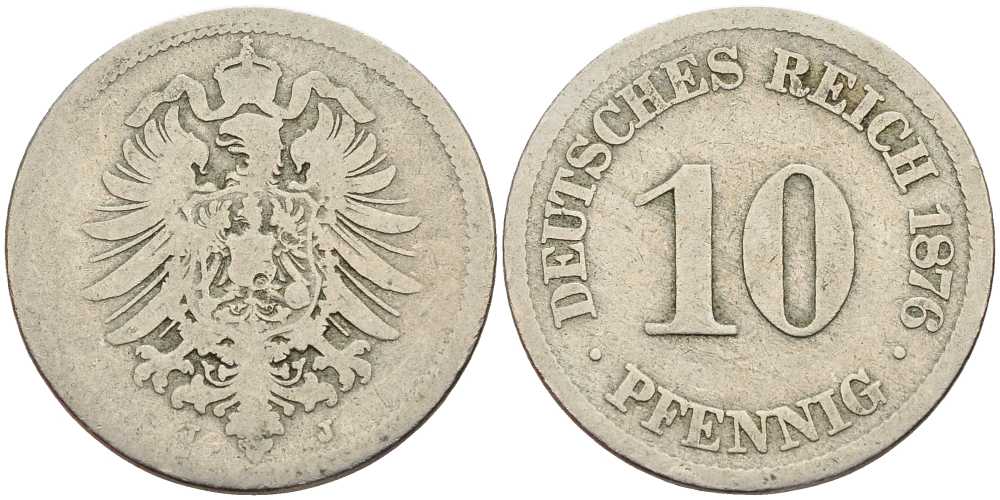 Германия 10 пфеннигов 1876 J, старогербовка KM 4, Jager 4, Weege 7 медно-никель 4401-314