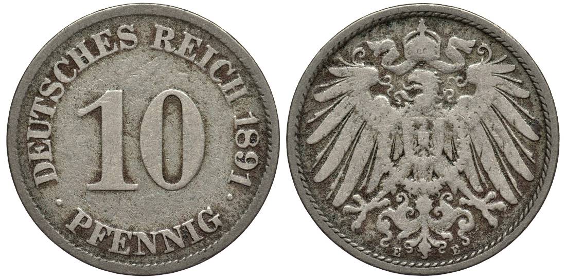 ГЕРМАНИЯ 10 ПФЕННИГОВ 1891 E KM 12, Jager 13, Weege 8 медно-никель 4513-711