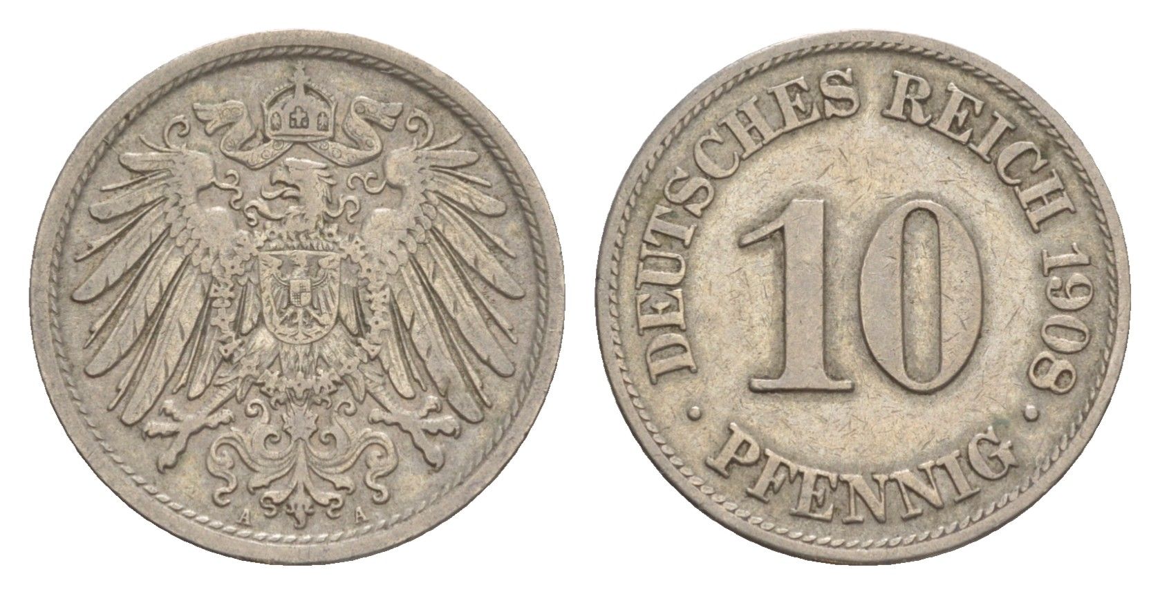 Германия 10 пфеннигов 1908 A, Вильгельм II (1888-1918) KM 12, J. 13 медно-никель 4647-918