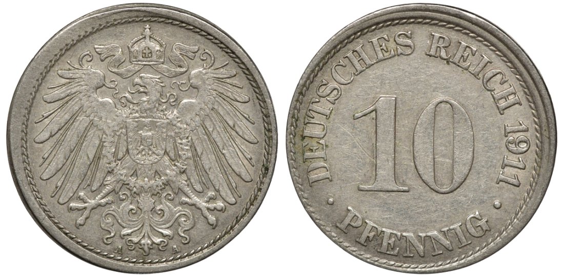 ГЕРМАНИЯ 10 ПФЕННИГОВ 1911 А, БРАК, СМЕШЕНИЕ KM 12, J. 13, Weege 8 медно-никель 1518-1545