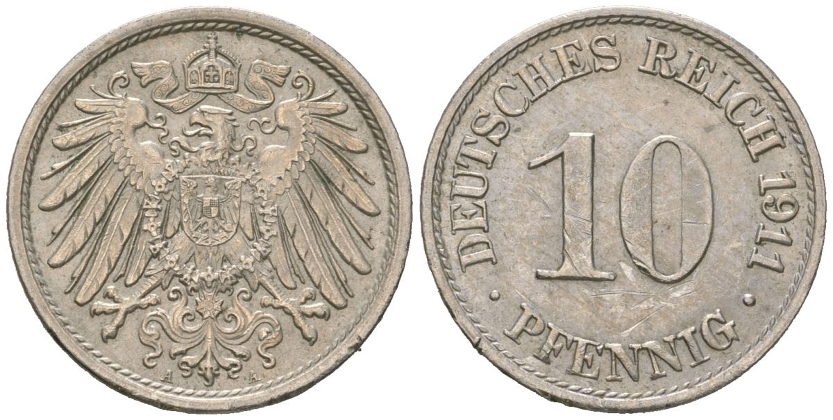Германия 10 пфеннигов 1911 A KM 12, J. 13 медно-никель 4613-123