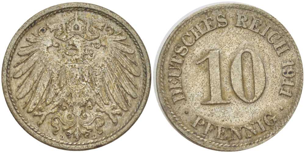ГЕРМАНИЯ 10 ПФЕННИГОВ 1911 D KM 12, J. 13, Weege 8 медно-никель 212-146