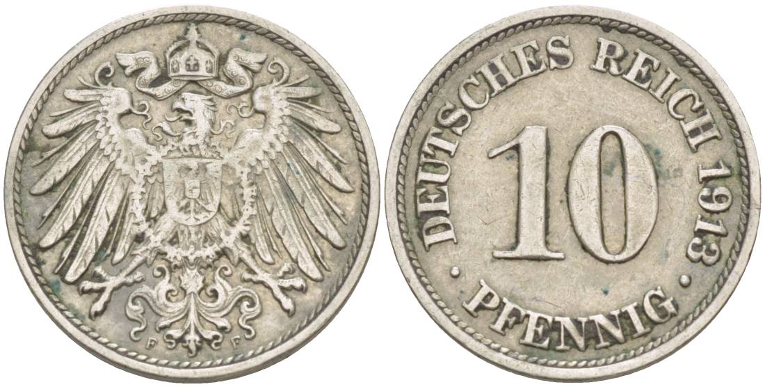 ГЕРМАНИЯ 10 ПФЕННИГОВ 1913 F KM 12, Jager 13, Weege 8 медно-никель 219-234