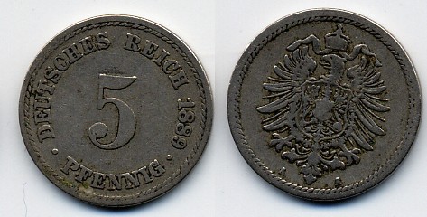 ГЕРМАНИЯ 5 ПФЕННИГОВ 1889 A, СТАРОГЕРБОВКА KM 3, J.3 медно-никель 51-5043