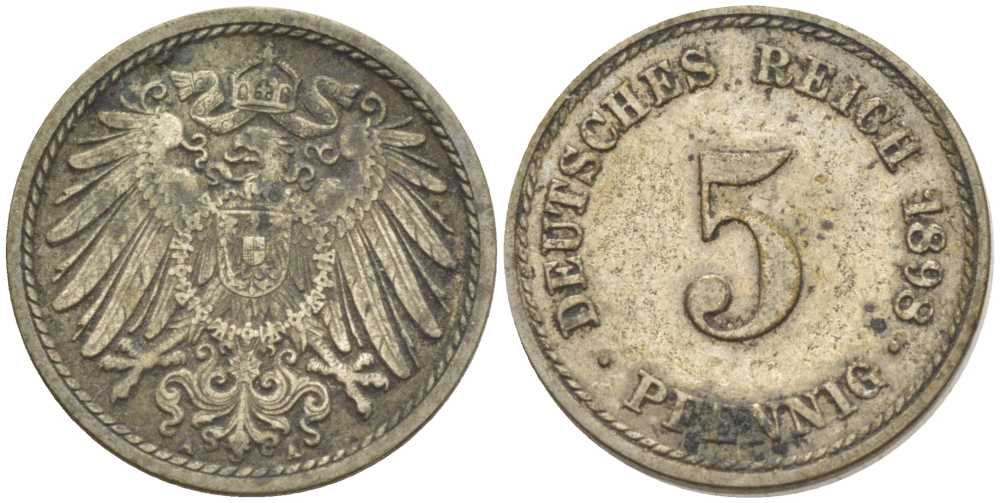 ГЕРМАНИЯ 5 ПФЕННИГОВ 1898 A KM 11, J. 12, Weege 6 медно-никель 206-919