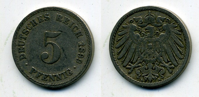 ГЕРМАНИЯ 5 ПФЕННИГОВ 1899 A, KM 11, J. 12 медно-никель 58-353