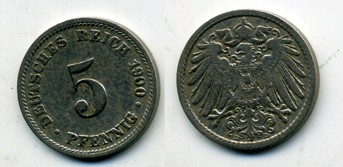 ГЕРМАНИЯ 5 ПФЕННИГОВ 1900 D, KM 11, J. 12 медно-никель 58-1122