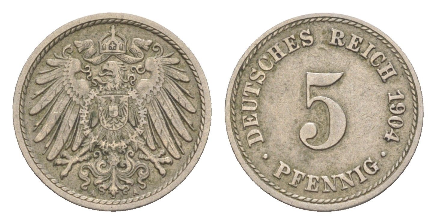 Германия 5 пфеннигов 1904 A, Вильгельм II (1888-1918) KM 11, J. 12 медно-никель 4647-861